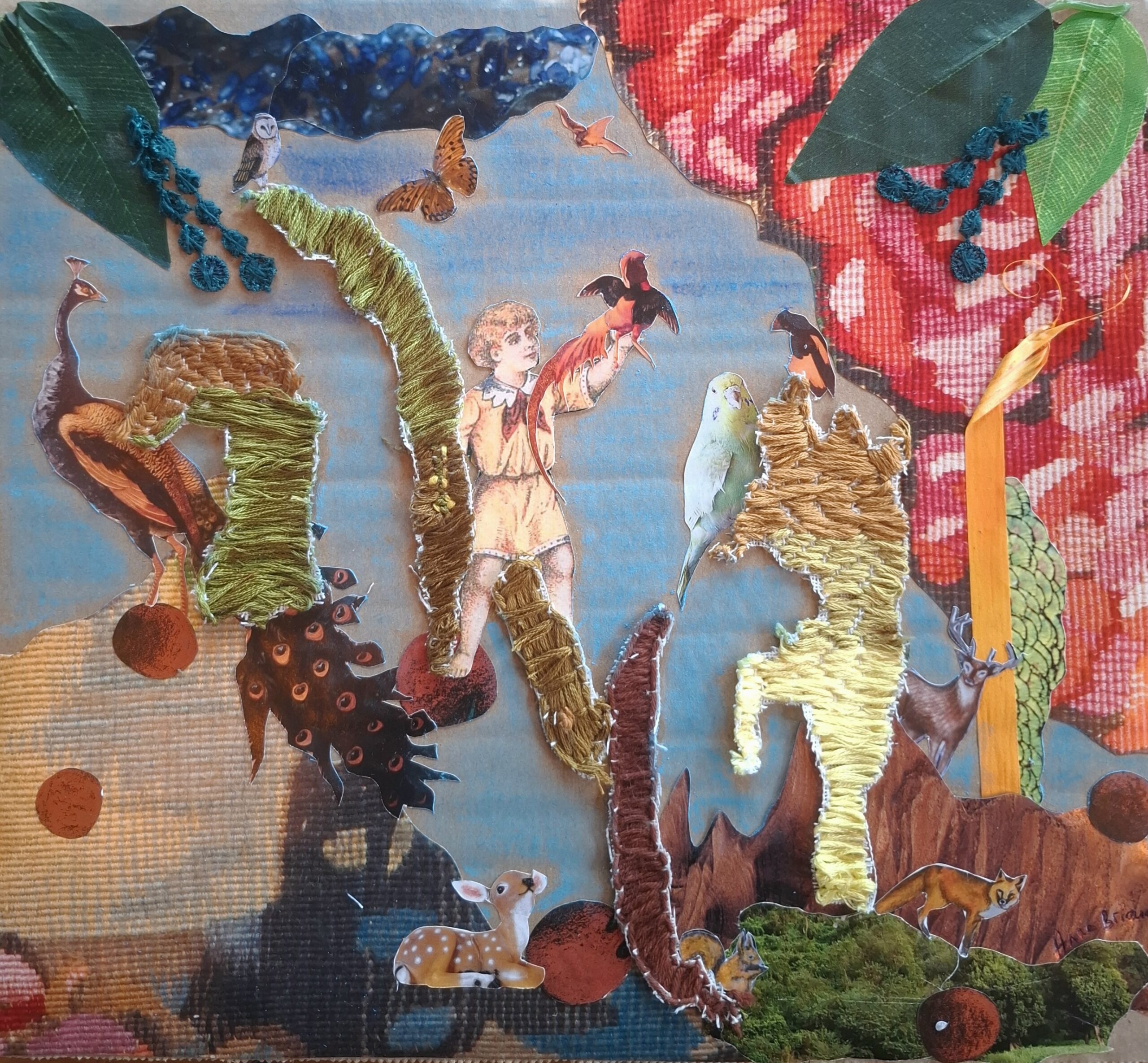 Collage sur carton de papiers et petites pièces brodées, pastel sec.